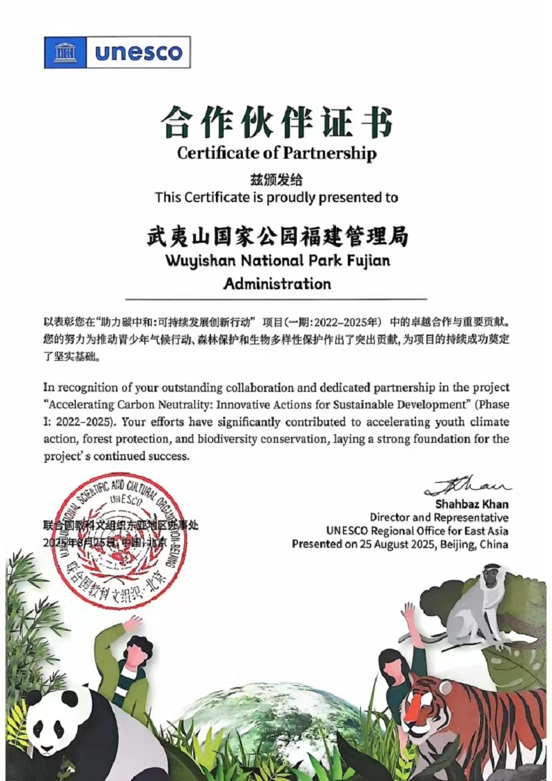联合国教科文组织向武夷山国家公园颁发合作伙伴证书