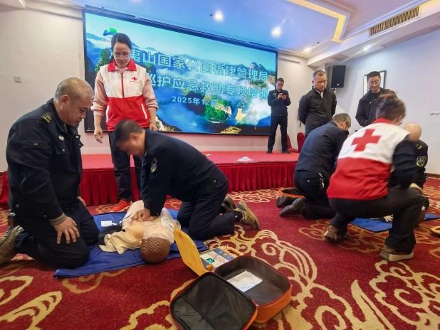 户外应急救助专项培训针对生态巡护工作位于户外,应急危险突发性强等特点,立足“实用性”与“操作性”,邀请了武夷山市红十字会专业老师,对心肺复苏(CPR)、自动体外除颤器(AED)使用、气道异物梗阻解除等核心急救技能及创伤出血、骨折固定、蛇伤处置、心理疏导等常见应急情况进行了理论讲解和现场模拟教学,有效提升了管护人员在野外或突发事件现场的初步医疗救助能力和风险防范意识,强化安全保障。