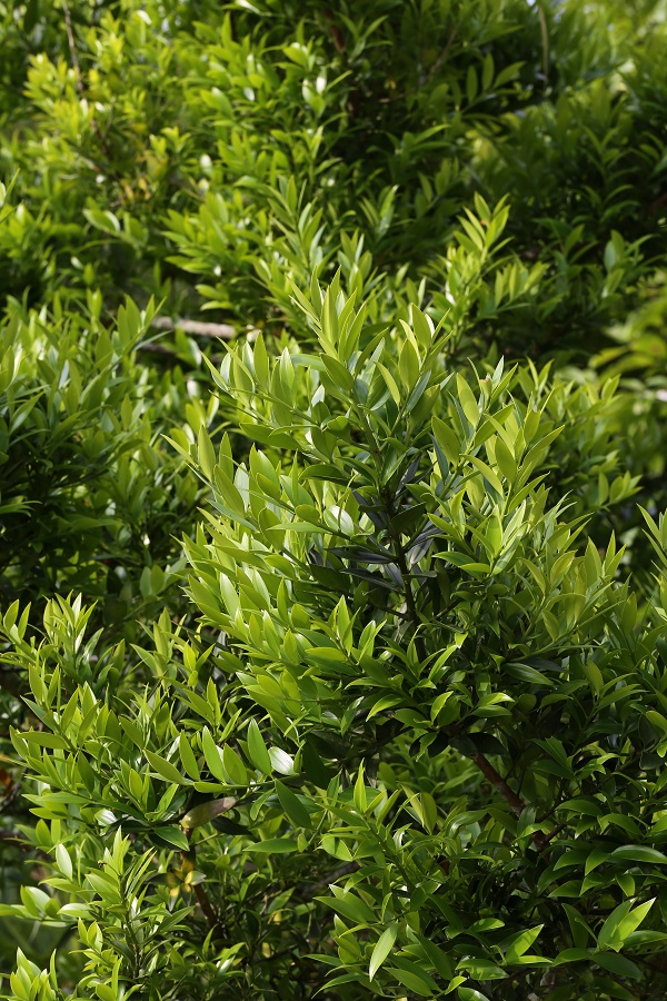 竹柏的树皮红褐或暗紫红色,衰老时先裂成一块块小小的薄片之后再脱落,这是很多乔木树皮的共性;枝条直挺挺地伸展,形成了圆锥形的树冠。虽像竹叶,但竹柏的两片叶子相对而生,而竹叶一般是错开生长的。揉碎竹柏叶,能闻到芭乐的清香,因此它也常被提炼成精油,有很强的杀虫、抑菌活性。同时,它那独特的气味还能驱蚊、净化空气。