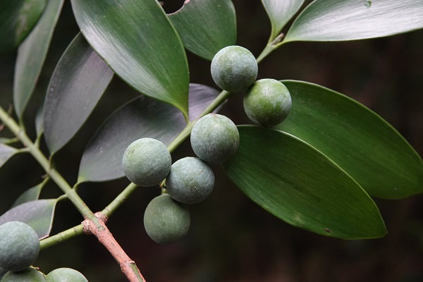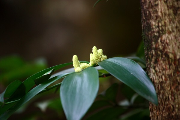 竹柏的花与马尾松等裸子植物类似,没有明显的花瓣,植物学上叫它球花。雄球花圆柱形穗状,每个都单独生长在叶柄的基部与枝条相接处的内侧(单生叶腋);雌球花比较小,生长部位和雄球花一样,偶尔是两个一起生长(稀成对腋生);种子小小的、圆球形很可爱,被一层白色的粉包裹着,从绿色变成暗紫色时它就成熟了,那时正直十月。竹柏种子富含油脂,亚油酸的含量比较高,在医药上具有一定的价值,而且品质优良。